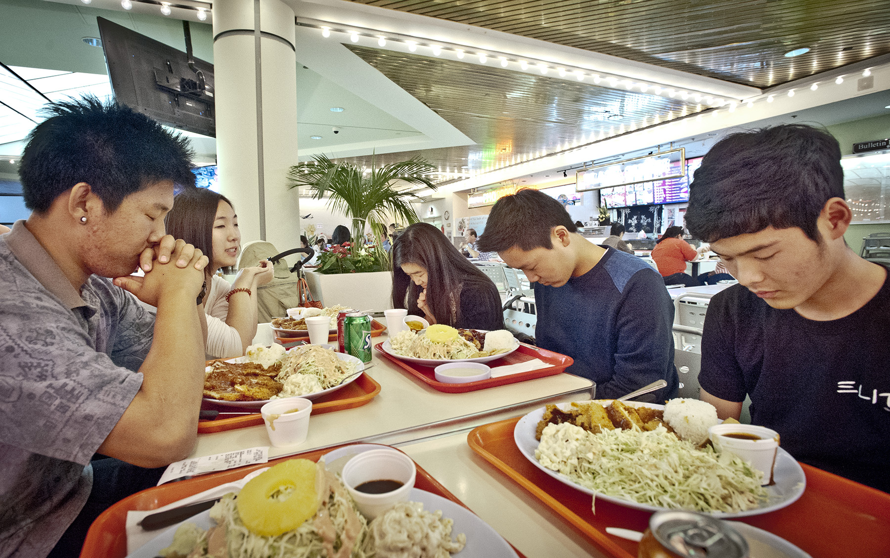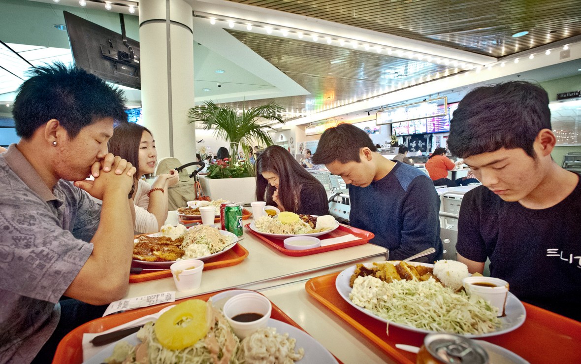 Students from Pastor James’ youth group at the Oriental Mission Church on Western Avenue say grace before having lunch at the Koreatown Plaza food court. Most of the group said they felt it was hard to find things for them to do in Koreatown, describing a distinction between the culture they know through the OMC and the culture of “K-towners”. “Pretty much the only thing to do in Koreatown is drink, and since we can’t do that, we go to karaoke bars. We don’t drink there, but we just sing. There’s a lot of pool halls with billiards. there’s a lot of dessert places. I think Koreatown is really well known for their deserts, ice-cream, and boba. None of us are really K-towners. I don’t want to be messed up or anything, but they’re not the same as us. They’re kind of ghetto. They kind of look like skaters, but they wear really skinny jeans, Nike shoes, a backwards hat kind of look. A lot of them smoke.”