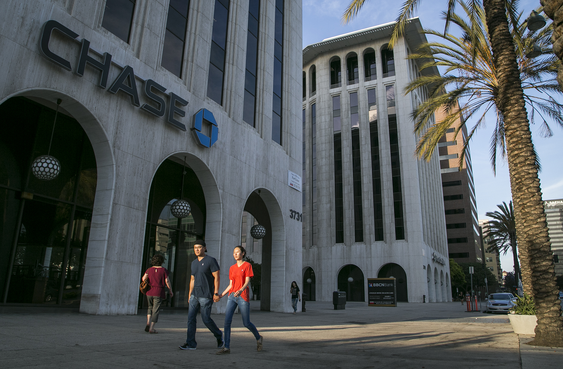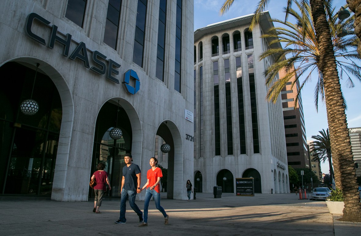 November 18, 2014 IMG_1023 Bystanders walk by a Chase bank, one of several high rise banks along Wilshire Boulevard