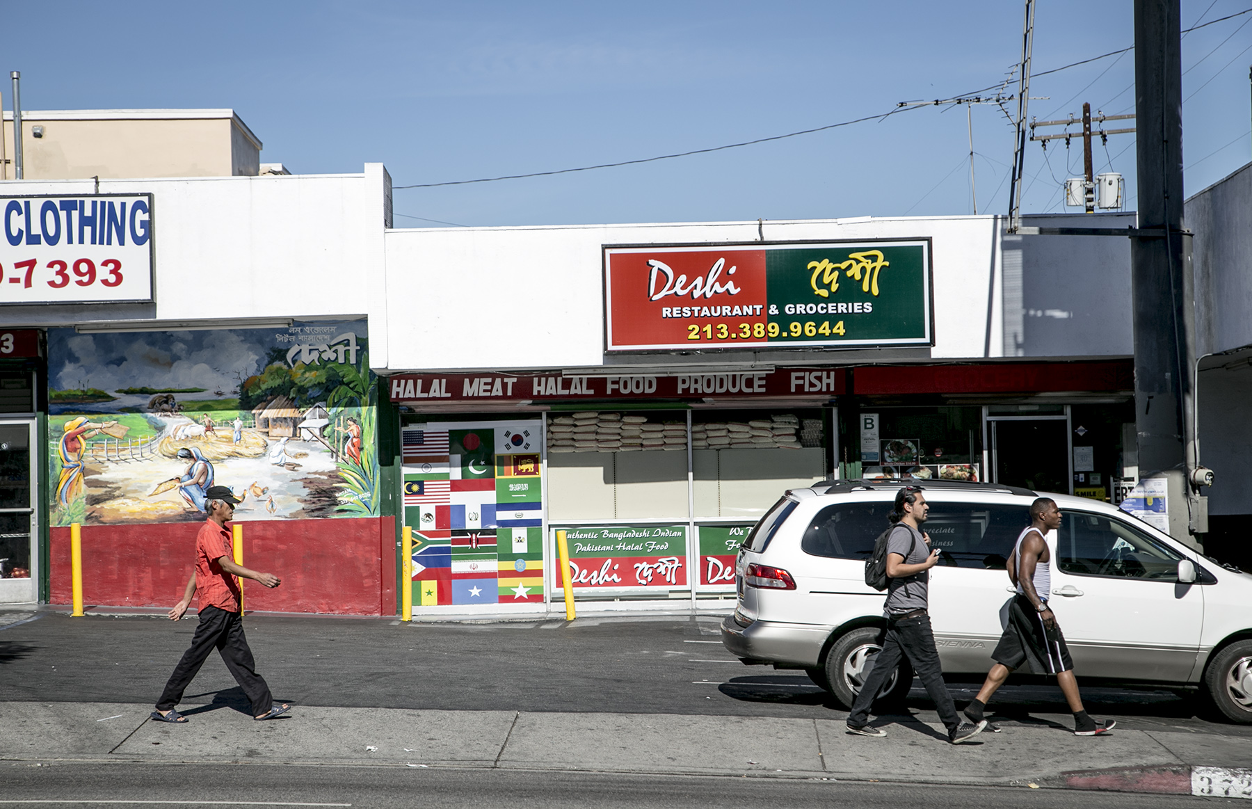 November 20, 2014 IMG_7575 Bystanders walk past one of several Bangladeshi shops located on 3rd Street in Koreatown in a small designation called Little Bangladesh. Additionally, establishments catering to the Central American population can be seen sharing the area as well