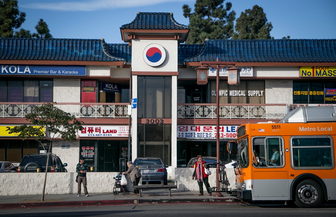 November 19, 2014 IMG_8006 Bystanders wait for the bus in front of the Chung Ki Wa Plaza shopping center, one of the oldest shopping centers in Koreatown, known for its Korean architecture