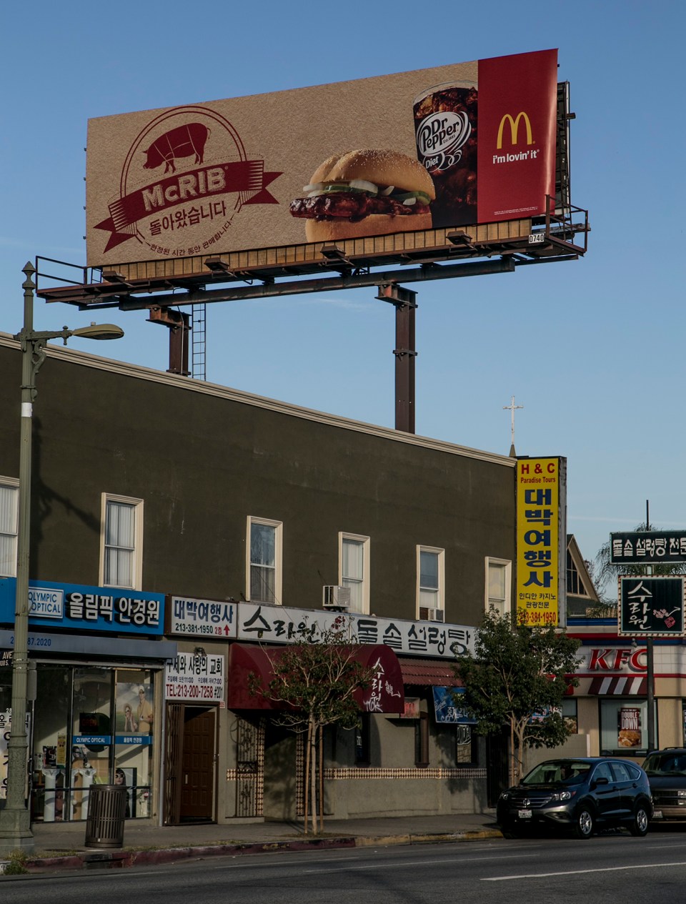 November 19, 2014 IMG_8031 A billboard advertising McDonalds catering to Korean speakers overlooks a mixed use shopping area displaying signs in Hangul on Dewey Avenue