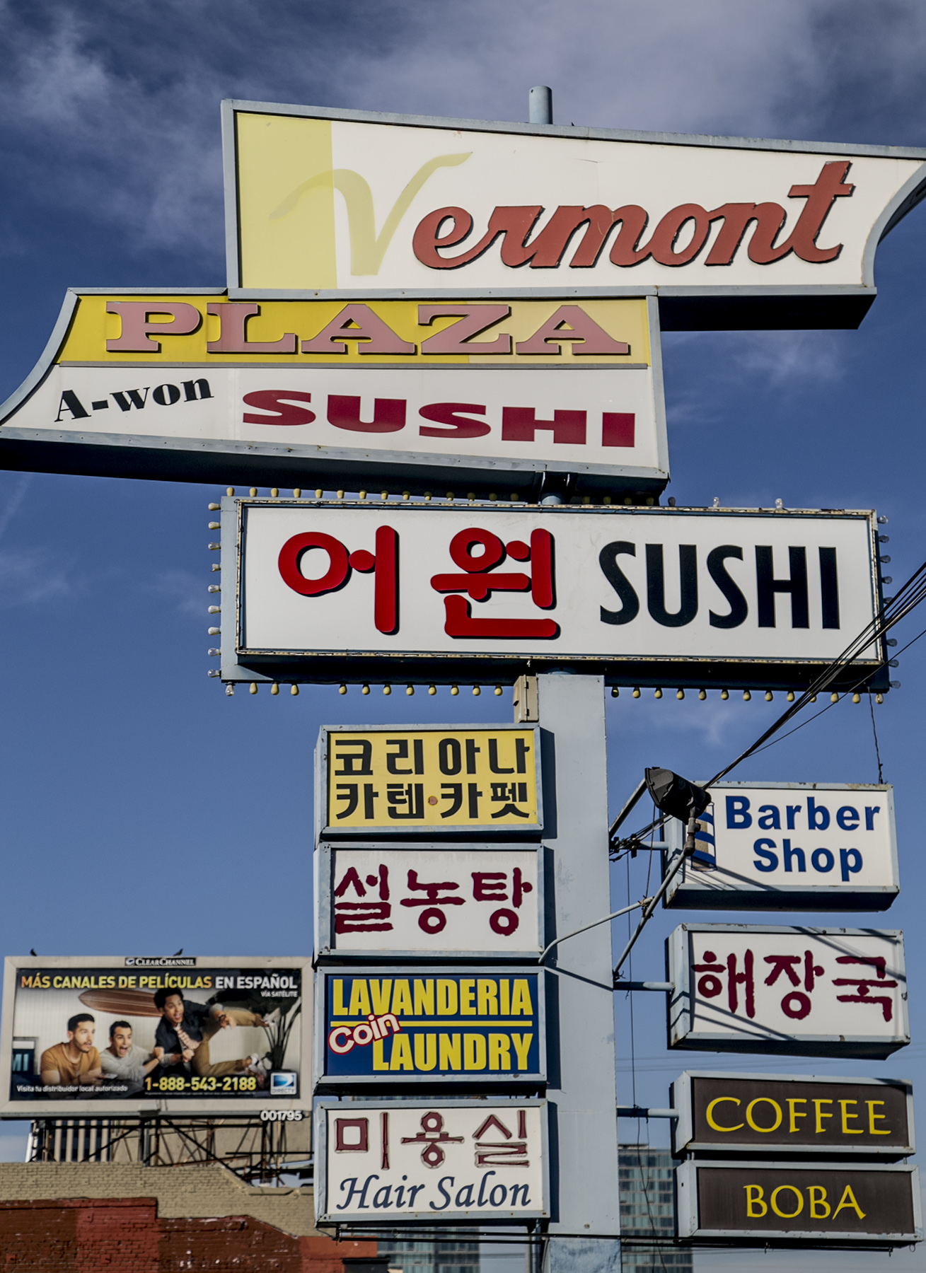November 23, 2014 IMG_8342 Business signs on San Marino Street catering mostly to Korean speakers. Behind it is billboard advertising Direct TV catering to Spanish speakers