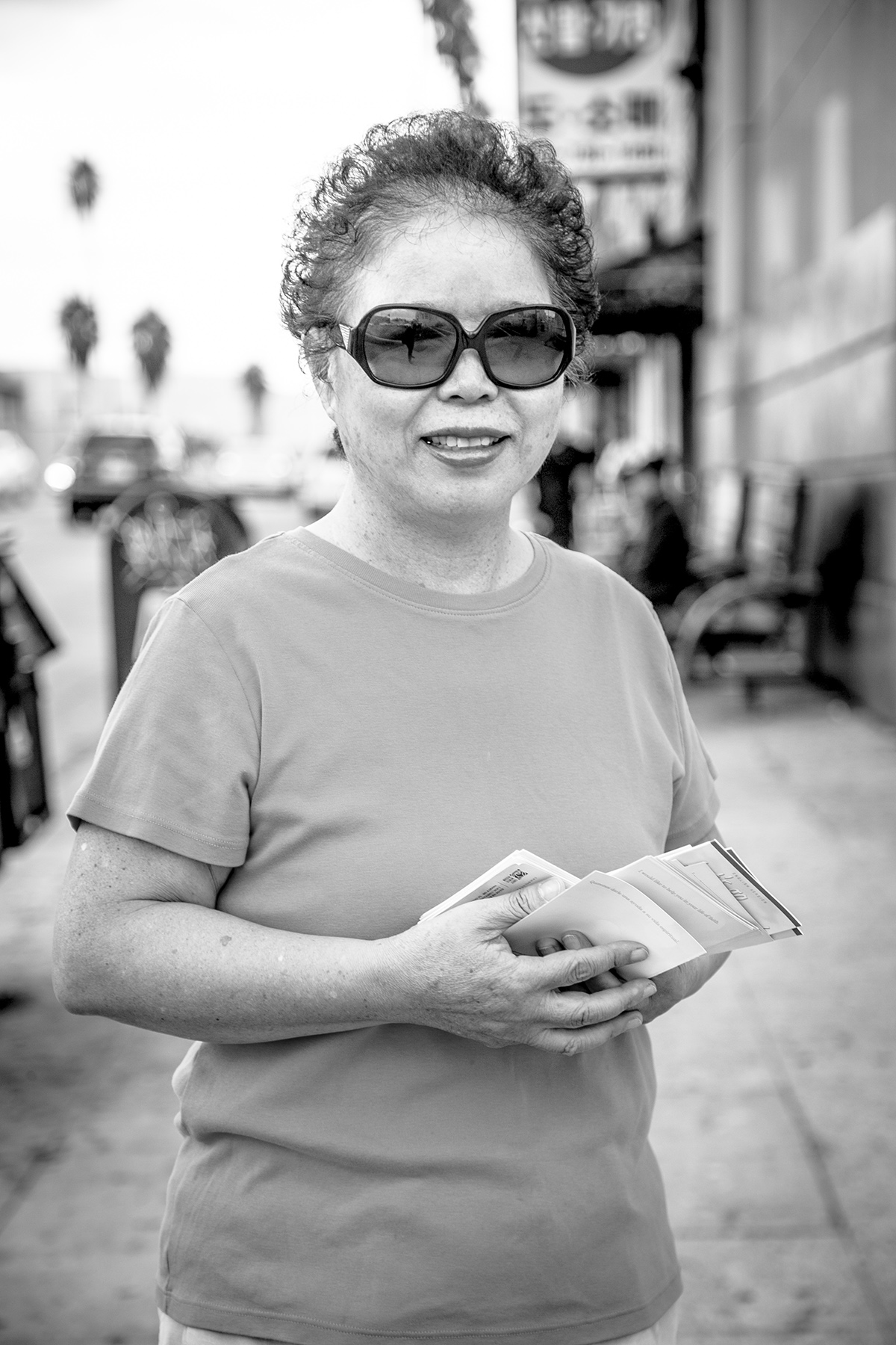Younny was passing out flyers for her church on the corner of Olympic Boulevard and Western Avenue. She moved to Los Angeles in 1977 and currently lives in Pasadena but travels to Koreatown every week to go to church and see her daughter who lives there. She said its easy to live in Koreatown because it is familiar. She said since she had started visiting Koreatown, the biggest changes she had seen were more buildings and markets