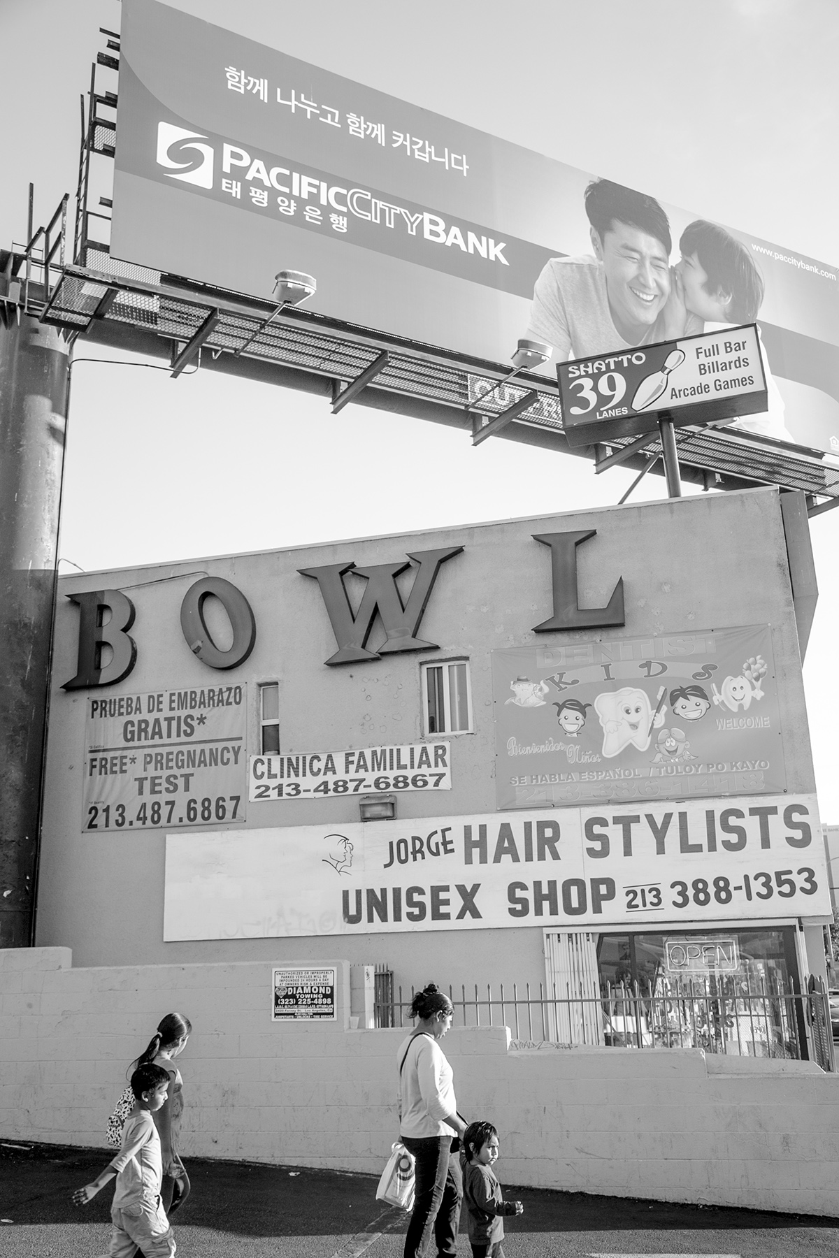 A bank billboard catering to Korean speakers is displayed over a bowling alley and mixed use shopping center catering to Spanish speakers near 4th Street and Vermont Avenue