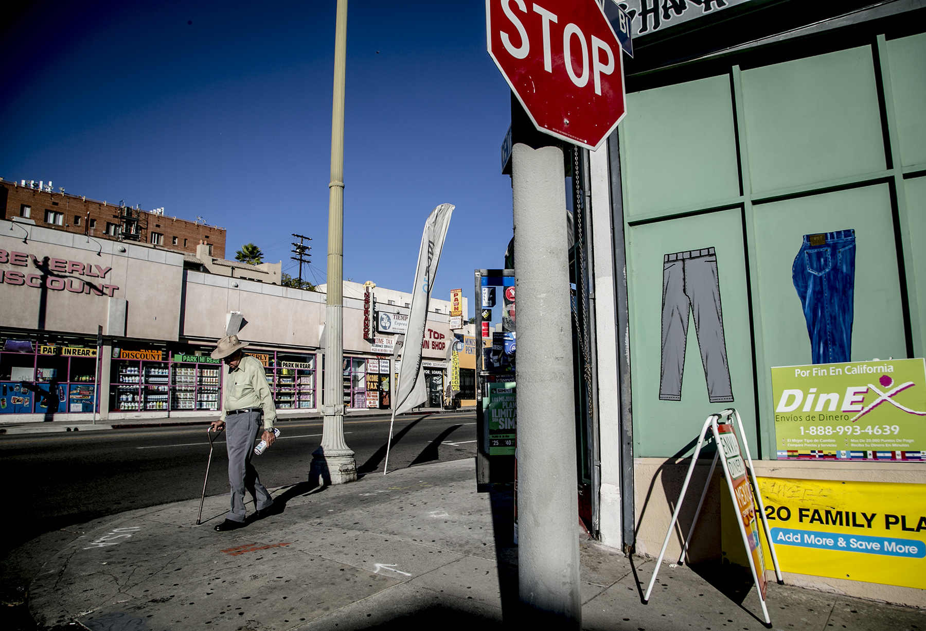 Bystanders walk past one of several Bangladeshi shops located on 3rd Street in Koreatown in a small designation called Little Bangladesh. Additionally, establishments catering to the Central American population can be seen sharing the area as well