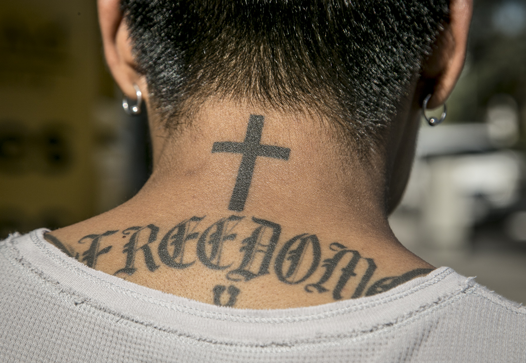 Xavier moved to Los Angeles 10 years ago from Mexico. He’s lived in Koreatown for 8 years. He said the biggest changes he said he had seen were more Latinos. On 3rd Street where he gets his hair cut, he said most of the Latinos there are from El Salvador, so people walking by will see many papusa restaurants. He said he wouldn’t change anything about the area, and that it’s perfect as it is. The police provide security for people there. His tattoo represents what he wants: to feel free to be whoever he wants to be, unlike how he felt when he was living in Mexico