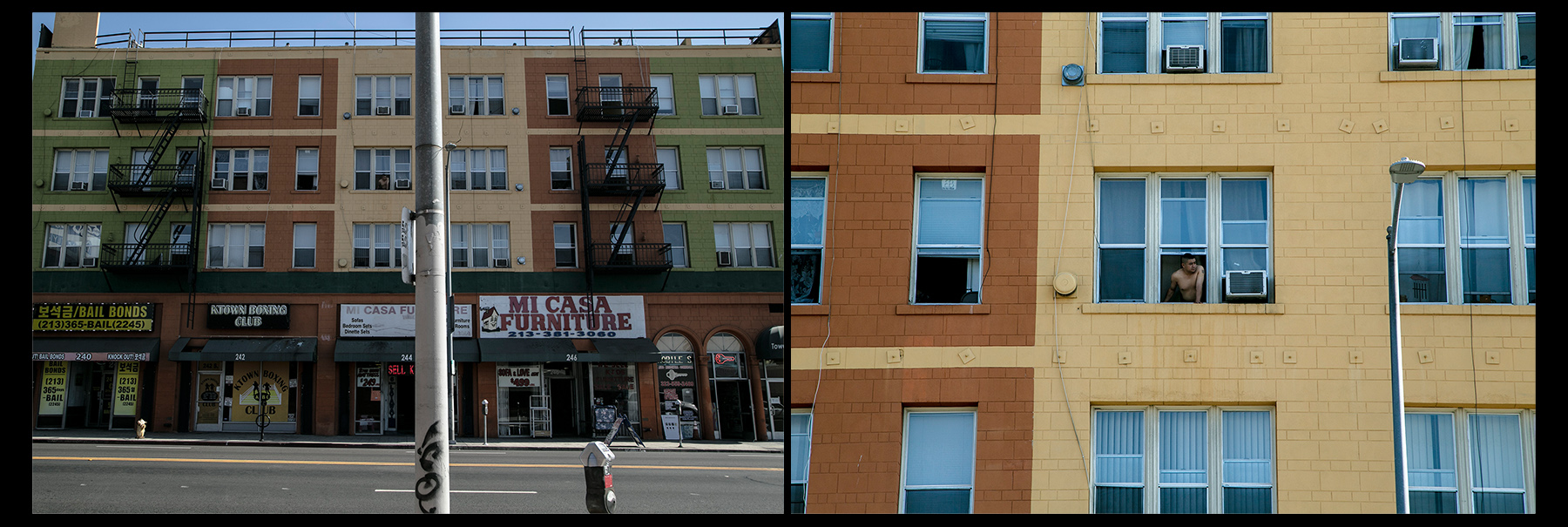 The portraits follow a static approach, most similar to the portraits I present in the ethnic enclave gallery: medium tight, three quarter shots showing some environmental elements in a portrait framing. I thought about Hine’s approach to surveys, the role of the photographer as a survey investigator, collecting a small and random sampling of Koreatown’s population. I met a wide spectrum of people when I was searching for portraits. Most of them were from Central America. I found most of the Hispanic people I met were very welcoming, easy to approach and open to the idea of having a portrait taken as well as a conversation, especially about the changes they wanted to see in Koreatown, additionally, welcoming the idea of me sending them a copy of the portrait I took. Many people I spoke with expressed that Koreatown needed more jobs available for people as well as smaller issues like more parking or repairing the sidewalks, but they weren’t unhappy living there. Several people expressed they were happy to be in a place that was both diverse and close to their cultures of origin.