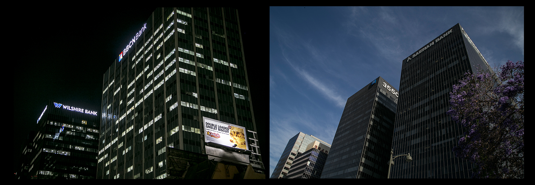 High rise buildings house three large Korean banks: BBCN, Saehan, and Wilshire Bank along Wilshire Boulevard