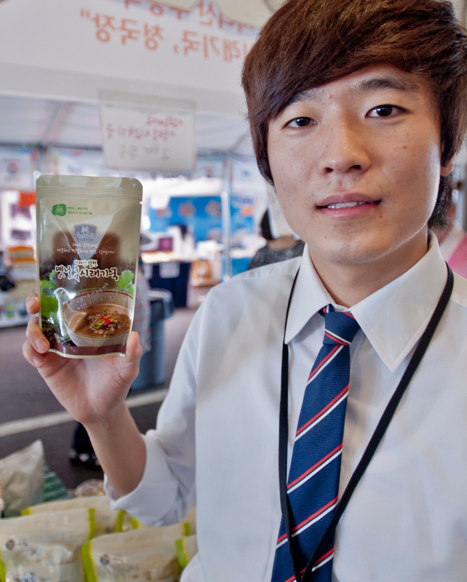 Oh Changhee, an economics student from Jin Ju, South Korea at the 40th annual Korean Festival in Koreatown. He is part of a program that incubates students to become experts on trading. He and his friends traveled to Los Angeles to practice sales in a foreign environment. His entrepreneurship program lasts three months where afterwards, he is expected to travel to other countries to participate in exhibits to share what he learned. He is holding a dry radish soup he and his two colleagues are selling at their table.