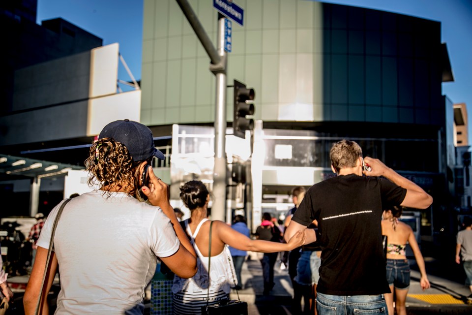 December 8, 2014 IMG_7404 Bystanders cross the street leading to the Metro Station on Western Avenue and Wilshire Boulevard