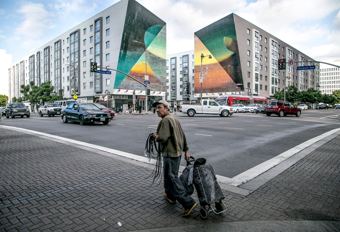 December 9, 2014 IMG_7831 A man selling belts crosses the street at the corner of Vermont Avenue and Wilshire Boulevard across from the Vermont Metro Station. A luxury apartment complex surrounds the Metro Station entrance